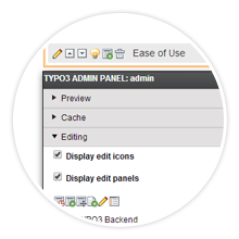 While the backend offers complete control over all site content, TYPO3 also includes a frontend editing interface for even faster, more intuitive content management by non-technical editors.