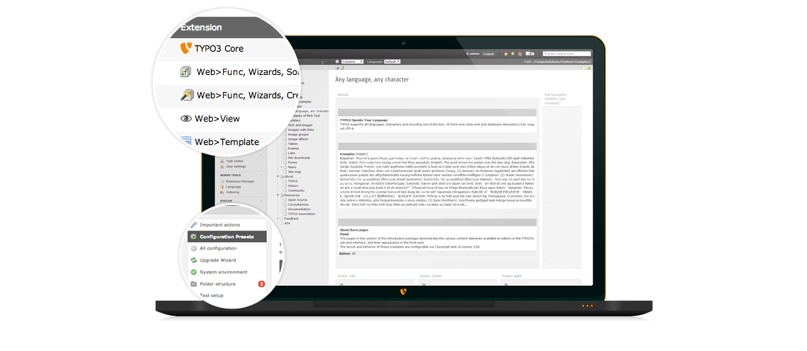 Because the TYPO3 frontend and backend are separate and distinct interfaces, developers have complete and total control of their frontend markup, CSS, and JavaScript, down to the most minute details.