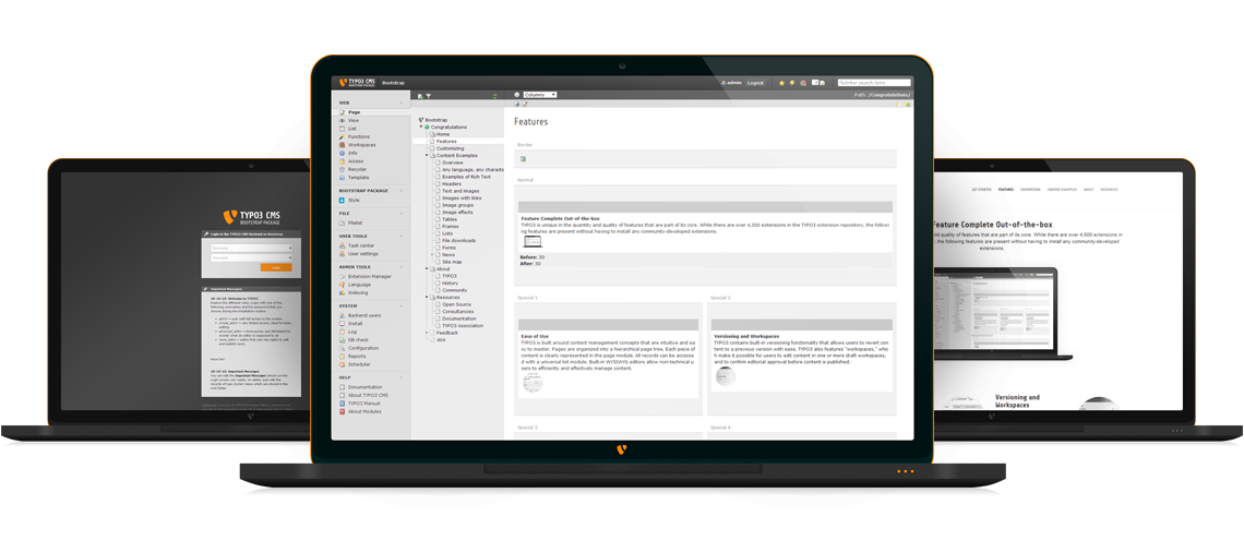 TYPO3 is unique in the quantity and quality of features that are part of its core. While there are over 6.000 extensions in the official TYPO3 Extension Repository, the following features are present without installing any community-developed extension.